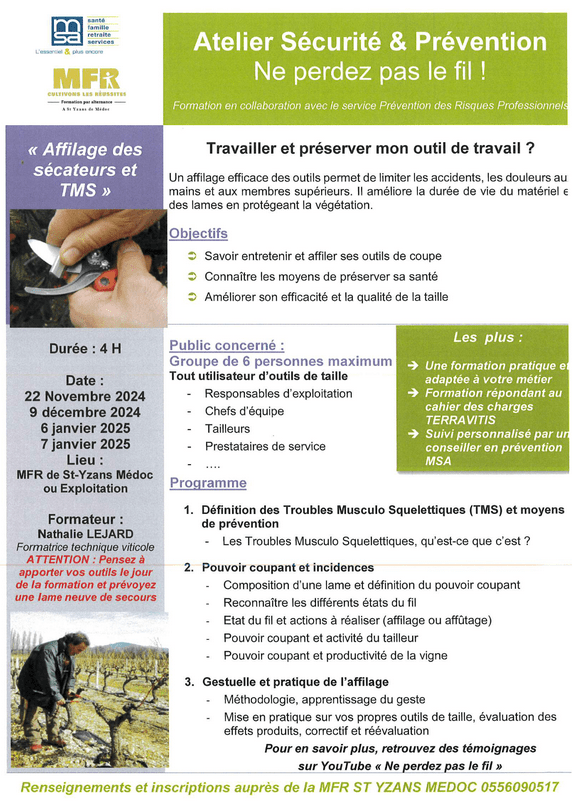 Formations adultes Vignerons du vivant, Ecole de la vigne, HSP, PRF, Certiphyto, SST, Ne perdez pas le fil