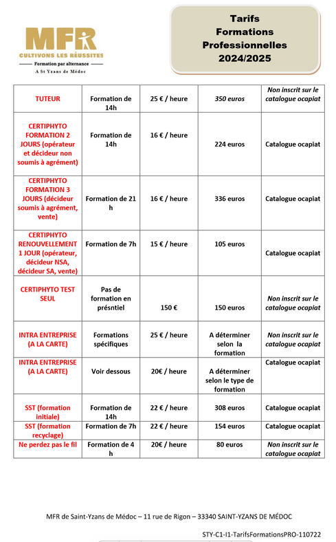 Pour toutes informations, questions ou réclamations, le client peut s’adresser au 05-56-09-05-17 du lundi au vendrdi, de 8h a 12h et de 13h30 à 17h15. Ou transmettre un e-mail à mfr.st-yzans-medoc@mfr.asso.fr