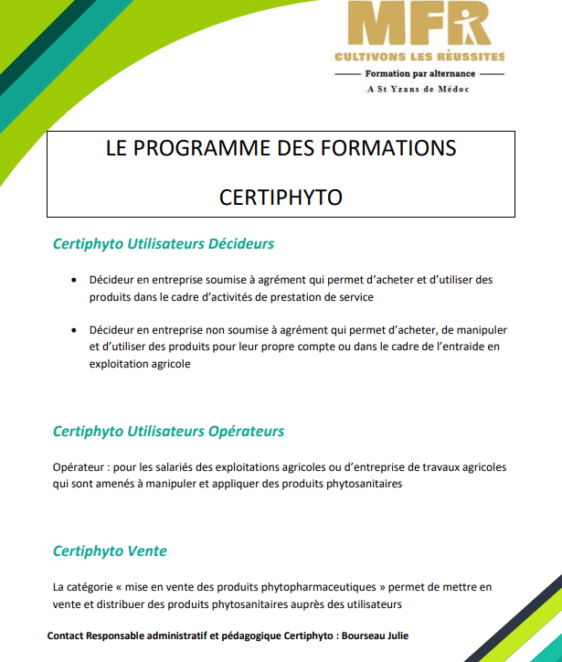 Toute l’actualité Formations adultes Bientôt, nouvelle formation adultes : Plus Belle la Vigne ! Renouvellement certiphyto Regardez votre date de validité de Certiphyto et contactez dès à présent la MFR : 2 formules s’offrent à vous,– une formation de 7 heuresou– un test seul QCM. Certification Qualiopi